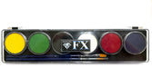 This Diamond FX Neon Palette contains wax-based, water-activated paints in the following colors: essential white, essential black, essential red, essential yellow, essential green, and essential dark blue. Also comes with a DFX Brush 900 No. 3 and Brush 901 No. 2. This palette can be refilled with 10gr cakes.