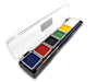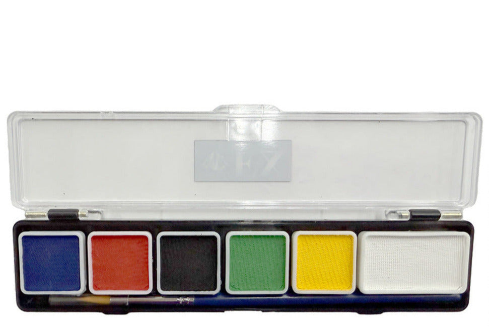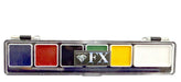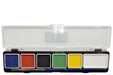 This Diamond FX Essential Palette contains wax-based, water-activated paints in the following colors: essential white, essential black, essential red, essential yellow, essential green, and essential dark blue.