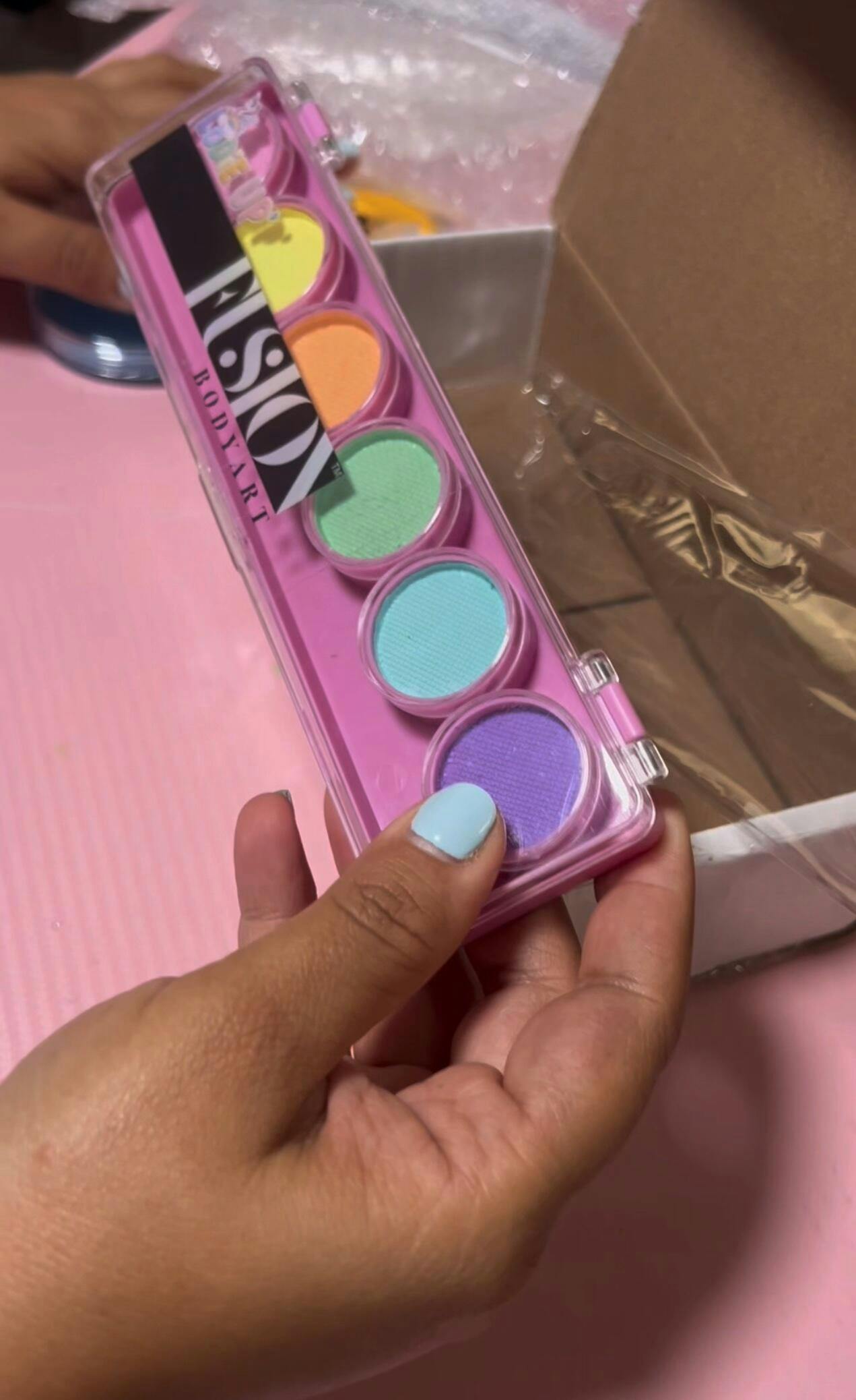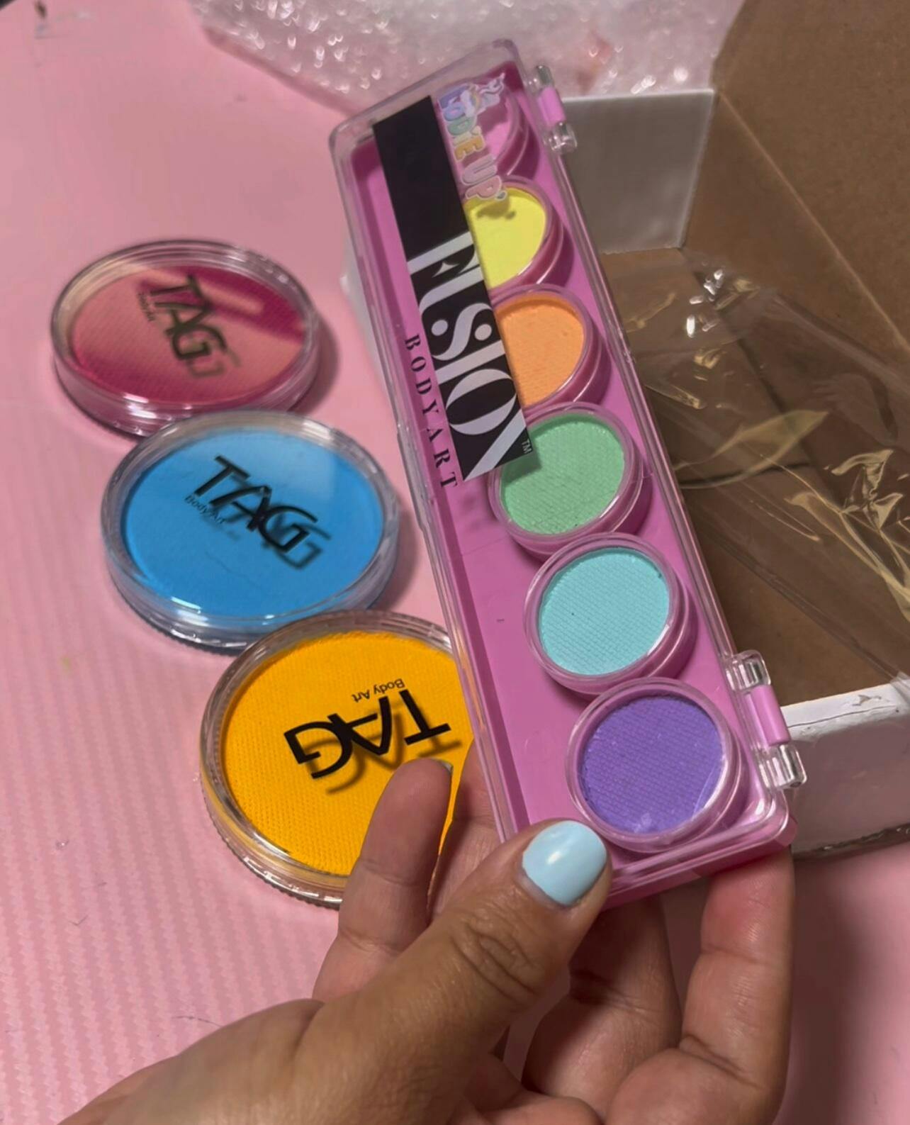 The Lodie Up Face Painting Palette, designed by Elodie, from Lodie Up Face Painting, features 6 pastel colors - soft pink, yellow, orange, mint green, light blue, and lilac. These exclusive colors are currently unavailable in a larger size.