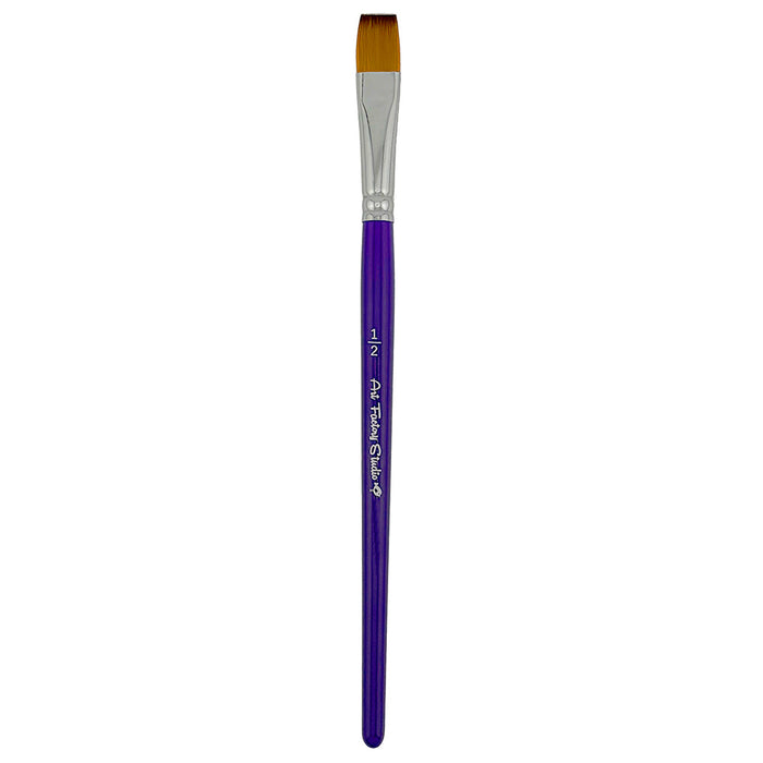 Our Flat Brush features brown Teklon bristles, measuring 5/8" long and 1/2" wide, perfect for detailed and precise face painting. With a short, painted wood handle and a seamless, nickel-plated ferrule, this brush combines durability and ease of use.